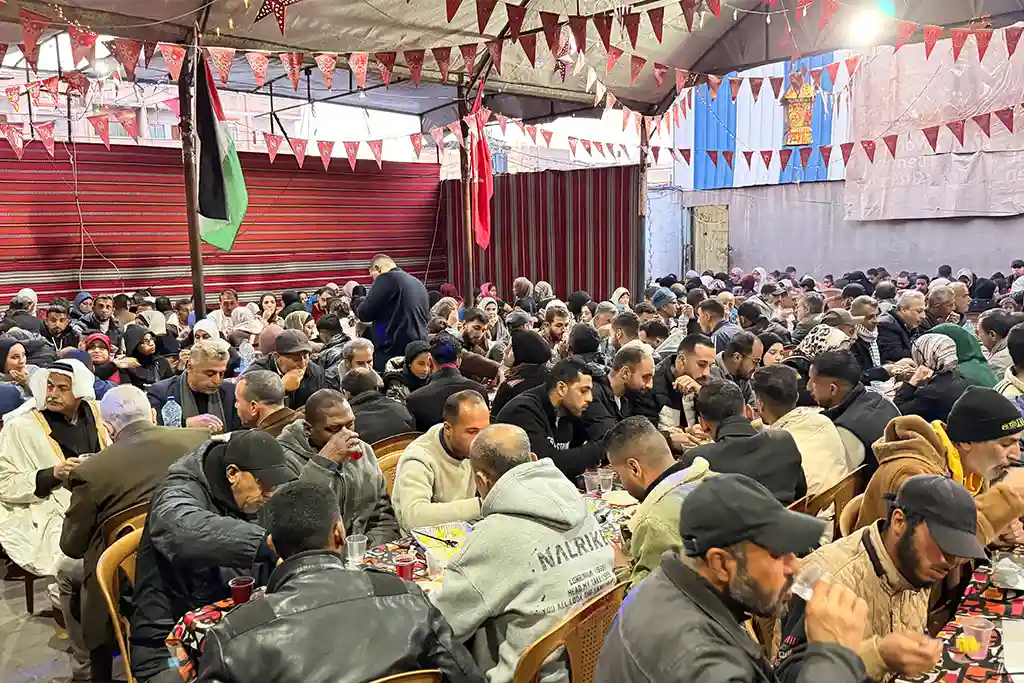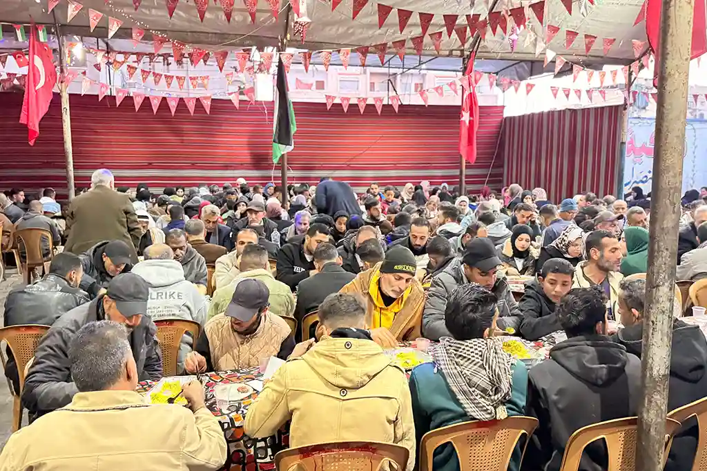 Hamidiye Aşevi’nde hazırlanan sıcak yemekler, kurulan iftar sofralarında Gazzeli ailelere ve ihtiyaç sahiplerine ikram edildi. Bölgedeki zor yaşam şartlarına rağmen her gün düzenlenen iftar programları sayesinde yüzlerce kişi aynı sofrada buluşarak oruçlarını açma imkânı buluyor.